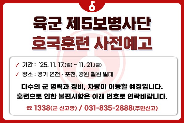 [연천,포천=백호현 대표기자] 육군 제5보병사단이 오는 17일부터 21일 5일동안 경기도 연천ㆍ포천과 강원도 철원 일대에서 호국훈련을 실시한다.