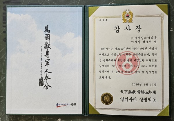 | [이사람] 백호현 세계밀리터리룩 이사장, 5보병사단 장병일동, 감사장받아 |